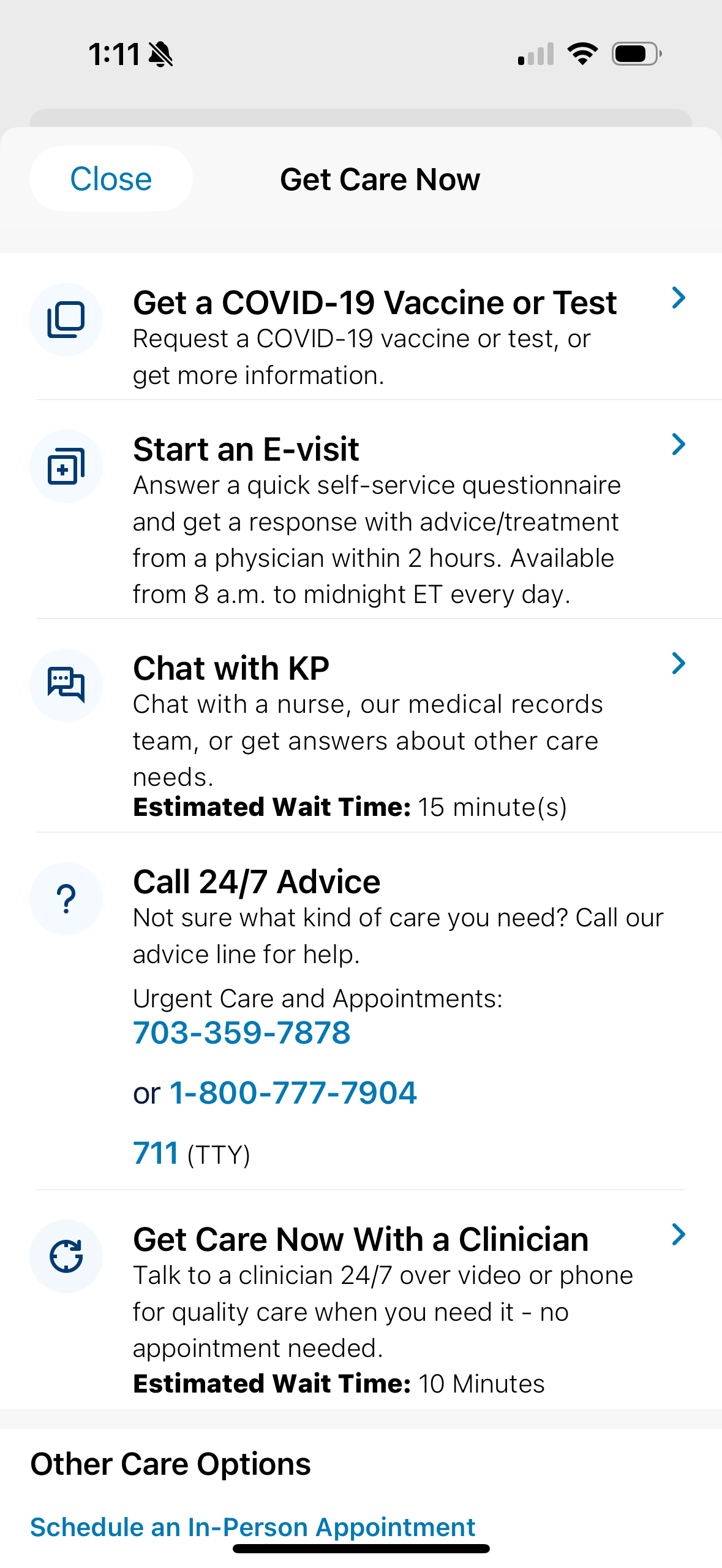 Log onto the KP app and scroll down to the Get Care section and select Get Care Now.